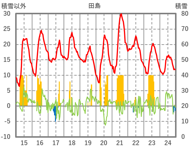 | 日 | 時 | 気温 | 降水 | 風向/風速 | 日照 | 積雪 | 降雪 |