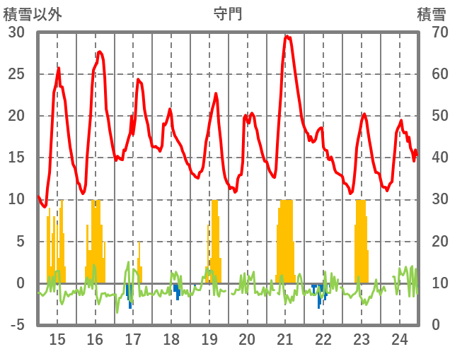 | 日 | 時 | 気温 | 降水 | 風向/風速 | 日照 | 積雪 | 降雪 |