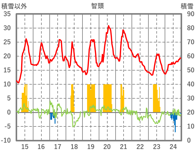 | 日 | 時 | 気温 | 降水 | 風向/風速 | 日照 | 積雪 | 降雪 |
