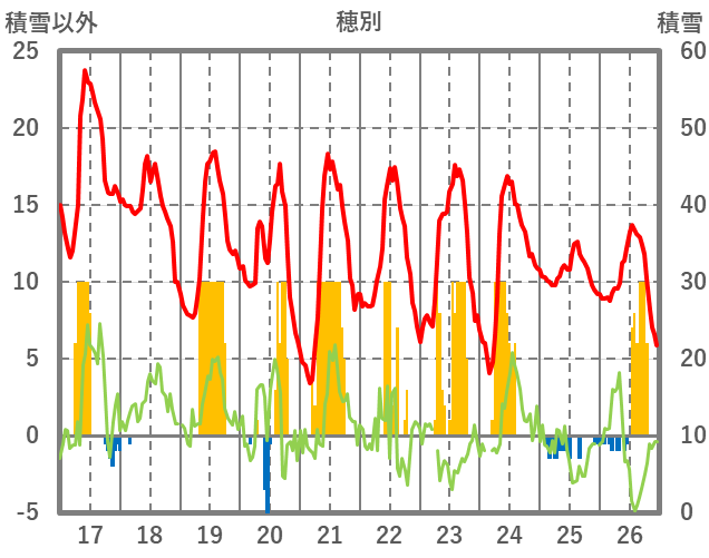| 日 | 時 | 気温 | 降水 | 風向/風速 | 日照 | 積雪 | 降雪 |