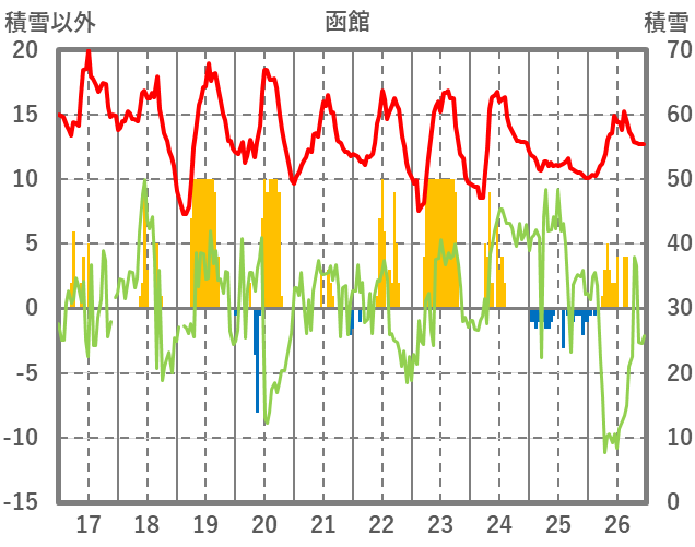 | 日 | 時 | 気温 | 降水 | 風向/風速 | 日照 | 積雪 | 降雪 |