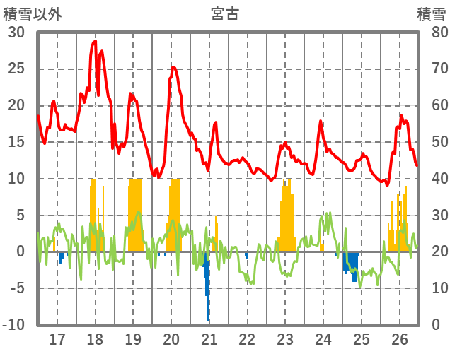 | 日 | 時 | 気温 | 降水 | 風向/風速 | 日照 | 積雪 | 降雪 |