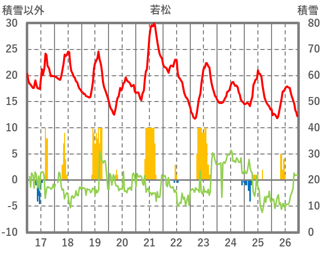 | 日 | 時 | 気温 | 降水 | 風向/風速 | 日照 | 積雪 | 降雪 |