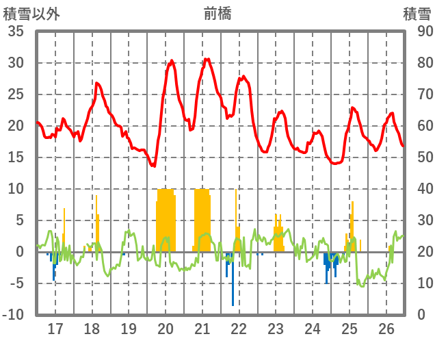 | 日 | 時 | 気温 | 降水 | 風向/風速 | 日照 | 積雪 | 降雪 |