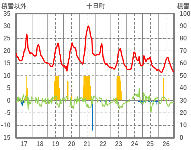 | 日 | 時 | 気温 | 降水 | 風向/風速 | 日照 | 積雪 | 降雪 |