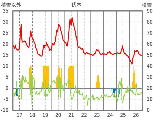 | 日 | 時 | 気温 | 降水 | 風向/風速 | 日照 | 積雪 | 降雪 |