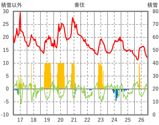| 日 | 時 | 気温 | 降水 | 風向/風速 | 日照 | 積雪 | 降雪 |