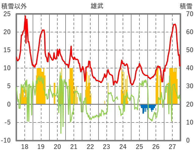 | 日 | 時 | 気温 | 降水 | 風向/風速 | 日照 | 積雪 | 降雪 |
