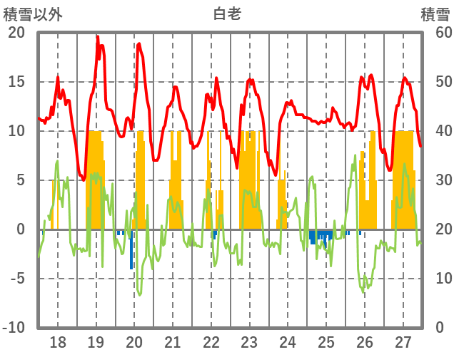 | 日 | 時 | 気温 | 降水 | 風向/風速 | 日照 | 積雪 | 降雪 |
