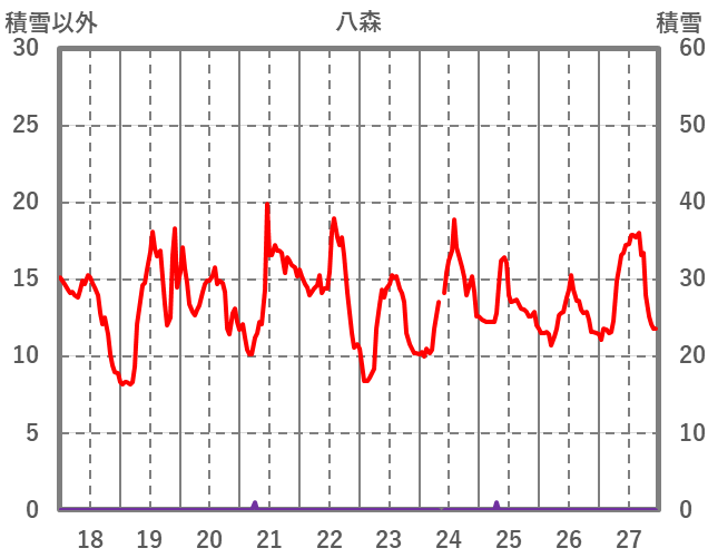 | 日 | 時 | 気温 | 降水 | 風向/風速 | 日照 | 積雪 | 降雪 |