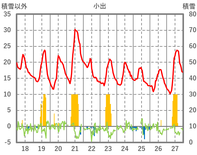 | 日 | 時 | 気温 | 降水 | 風向/風速 | 日照 | 積雪 | 降雪 |