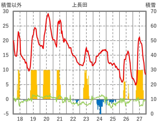 | 日 | 時 | 気温 | 降水 | 風向/風速 | 日照 | 積雪 | 降雪 |