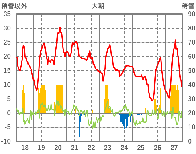 | 日 | 時 | 気温 | 降水 | 風向/風速 | 日照 | 積雪 | 降雪 |