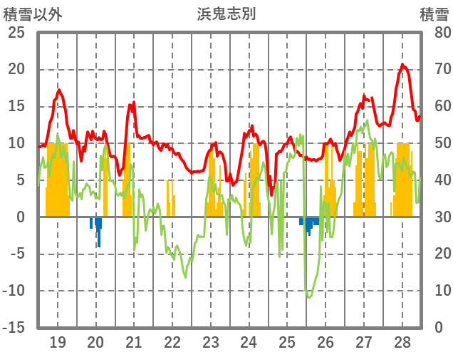 | 日 | 時 | 気温 | 降水 | 風向/風速 | 日照 | 積雪 | 降雪 |