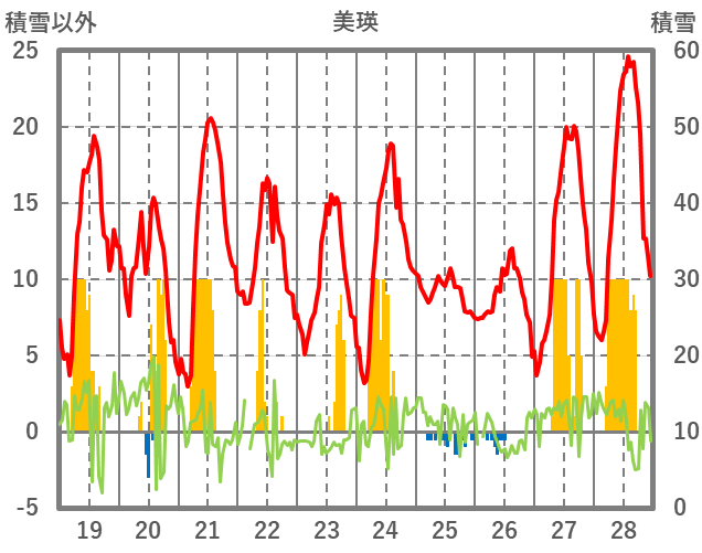 | 日 | 時 | 気温 | 降水 | 風向/風速 | 日照 | 積雪 | 降雪 |