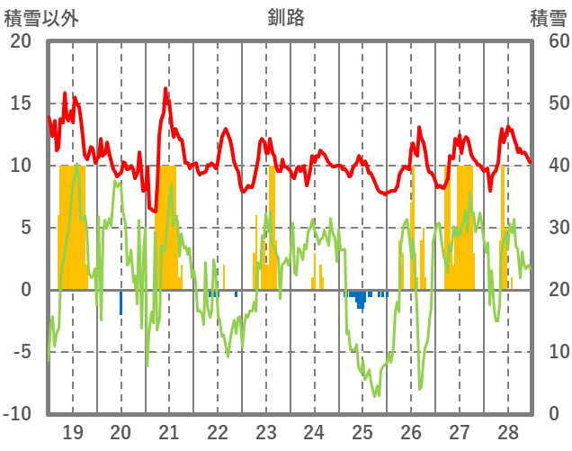 | 日 | 時 | 気温 | 降水 | 風向/風速 | 日照 | 積雪 | 降雪 |