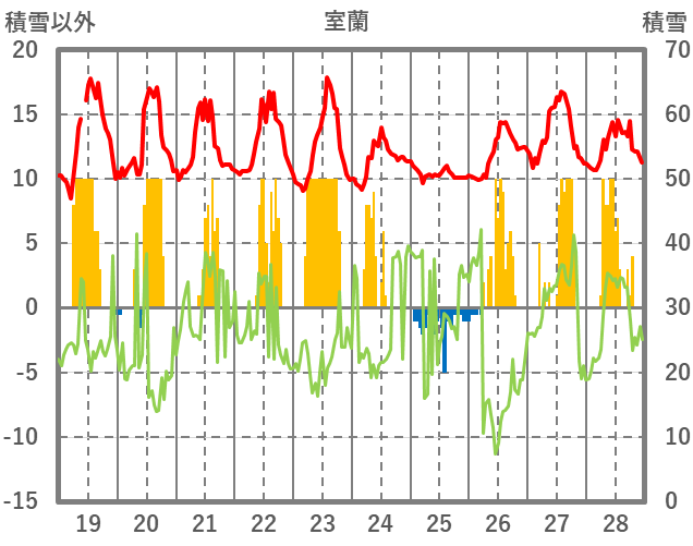 | 日 | 時 | 気温 | 降水 | 風向/風速 | 日照 | 積雪 | 降雪 |