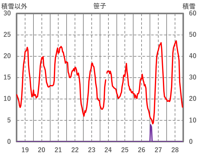 | 日 | 時 | 気温 | 降水 | 風向/風速 | 日照 | 積雪 | 降雪 |