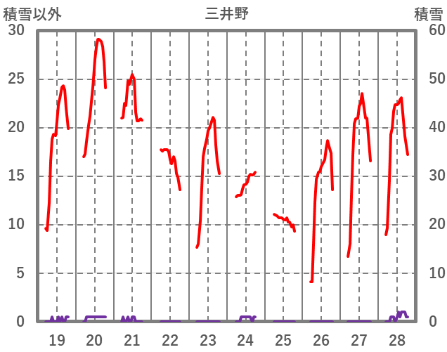| 日 | 時 | 気温 | 降水 | 風向/風速 | 日照 | 積雪 | 降雪 |