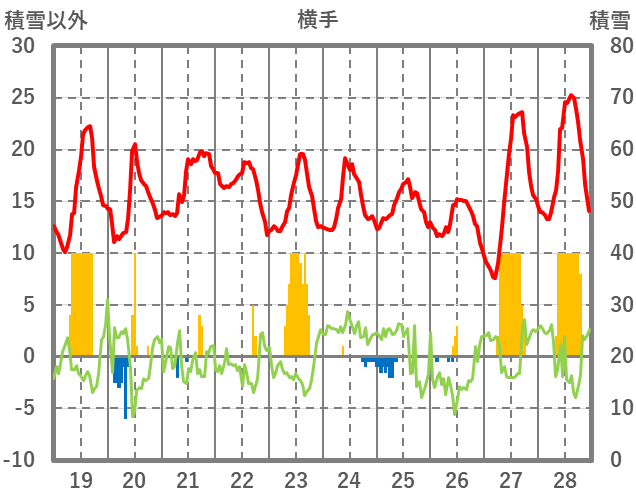 | 日 | 時 | 気温 | 降水 | 風向/風速 | 日照 | 積雪 | 降雪 |