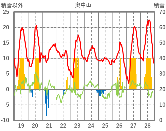 | 日 | 時 | 気温 | 降水 | 風向/風速 | 日照 | 積雪 | 降雪 |