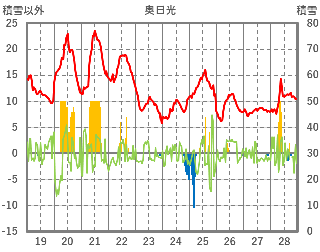 | 日 | 時 | 気温 | 降水 | 風向/風速 | 日照 | 積雪 | 降雪 |