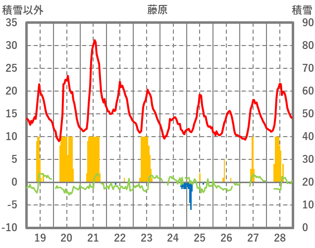 | 日 | 時 | 気温 | 降水 | 風向/風速 | 日照 | 積雪 | 降雪 |