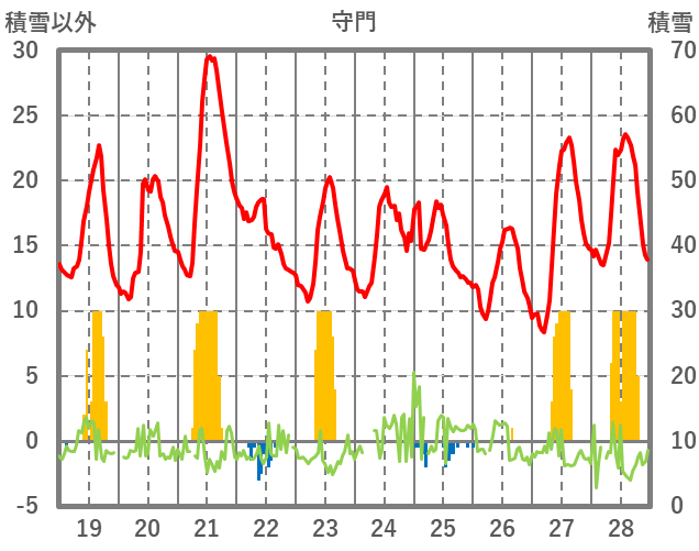| 日 | 時 | 気温 | 降水 | 風向/風速 | 日照 | 積雪 | 降雪 |