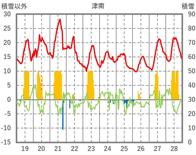 | 日 | 時 | 気温 | 降水 | 風向/風速 | 日照 | 積雪 | 降雪 |