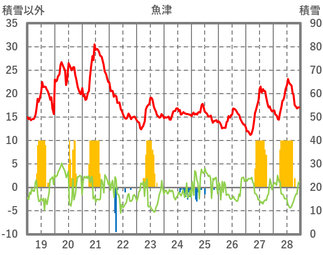 | 日 | 時 | 気温 | 降水 | 風向/風速 | 日照 | 積雪 | 降雪 |