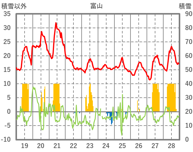 | 日 | 時 | 気温 | 降水 | 風向/風速 | 日照 | 積雪 | 降雪 |
