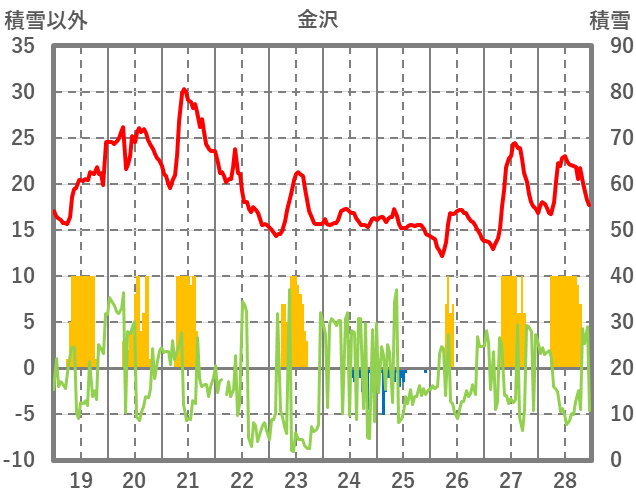 | 日 | 時 | 気温 | 降水 | 風向/風速 | 日照 | 積雪 | 降雪 |