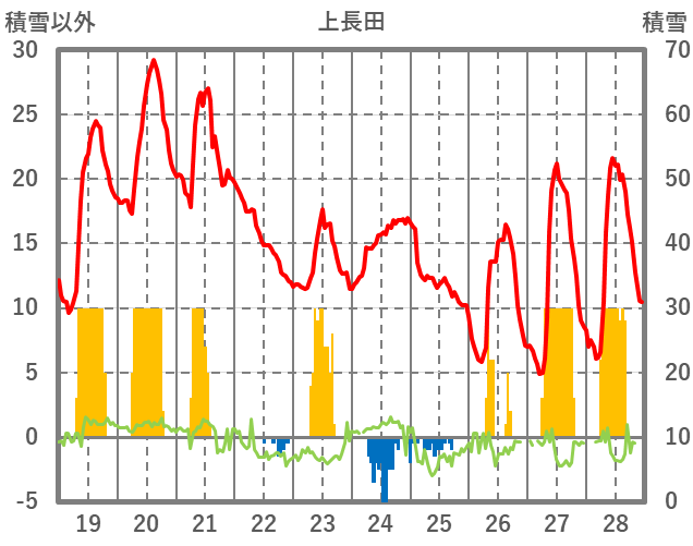 | 日 | 時 | 気温 | 降水 | 風向/風速 | 日照 | 積雪 | 降雪 |
