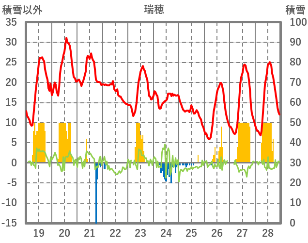 | 日 | 時 | 気温 | 降水 | 風向/風速 | 日照 | 積雪 | 降雪 |