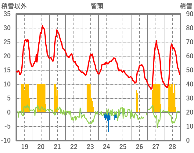| 日 | 時 | 気温 | 降水 | 風向/風速 | 日照 | 積雪 | 降雪 |