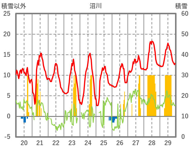 | 日 | 時 | 気温 | 降水 | 風向/風速 | 日照 | 積雪 | 降雪 |