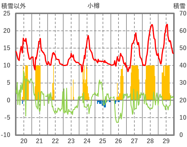 | 日 | 時 | 気温 | 降水 | 風向/風速 | 日照 | 積雪 | 降雪 |