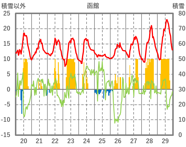 | 日 | 時 | 気温 | 降水 | 風向/風速 | 日照 | 積雪 | 降雪 |