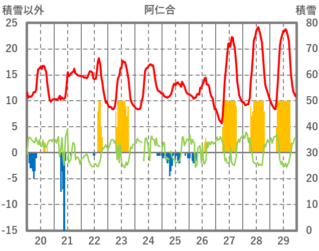 | 日 | 時 | 気温 | 降水 | 風向/風速 | 日照 | 積雪 | 降雪 |