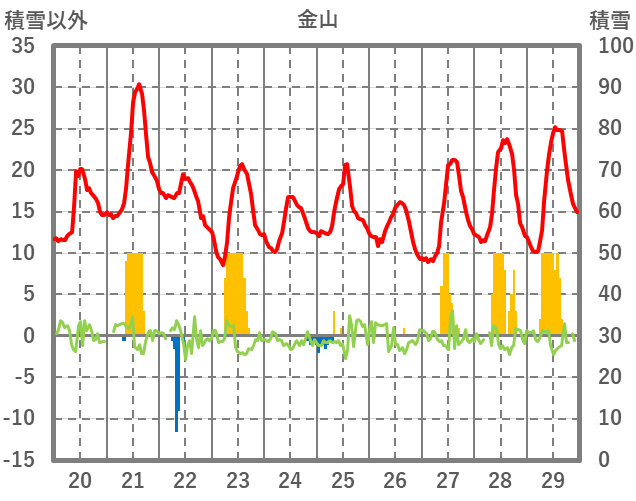 | 日 | 時 | 気温 | 降水 | 風向/風速 | 日照 | 積雪 | 降雪 |