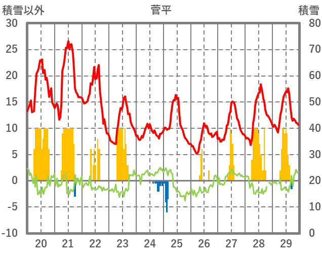 | 日 | 時 | 気温 | 降水 | 風向/風速 | 日照 | 積雪 | 降雪 |