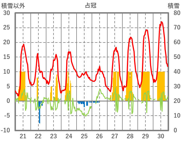 | 日 | 時 | 気温 | 降水 | 風向/風速 | 日照 | 積雪 | 降雪 |