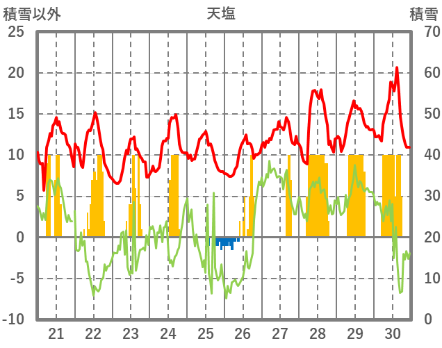 | 日 | 時 | 気温 | 降水 | 風向/風速 | 日照 | 積雪 | 降雪 |