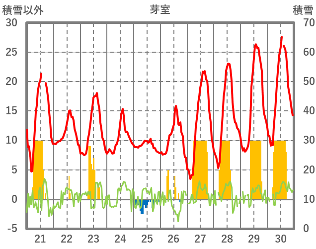 | 日 | 時 | 気温 | 降水 | 風向/風速 | 日照 | 積雪 | 降雪 |