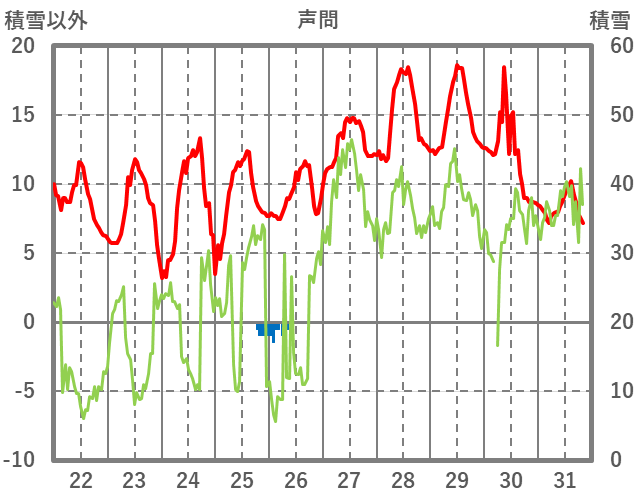 | 日 | 時 | 気温 | 降水 | 風向/風速 | 日照 | 積雪 | 降雪 |