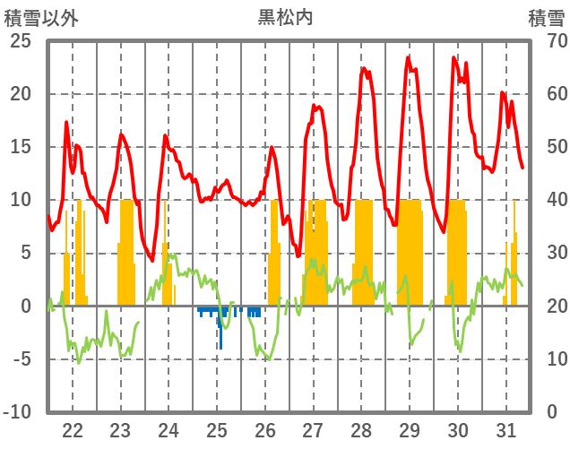 | 日 | 時 | 気温 | 降水 | 風向/風速 | 日照 | 積雪 | 降雪 |