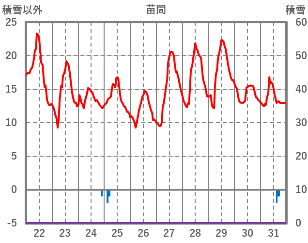 | 日 | 時 | 気温 | 降水 | 風向/風速 | 日照 | 積雪 | 降雪 |