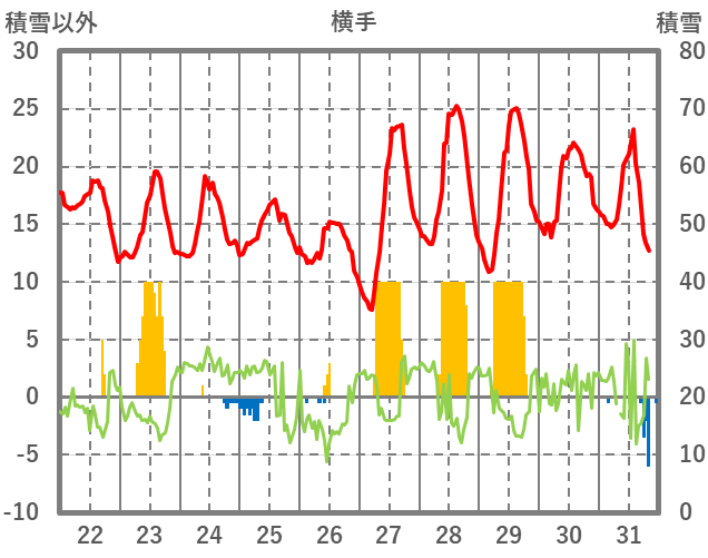 | 日 | 時 | 気温 | 降水 | 風向/風速 | 日照 | 積雪 | 降雪 |