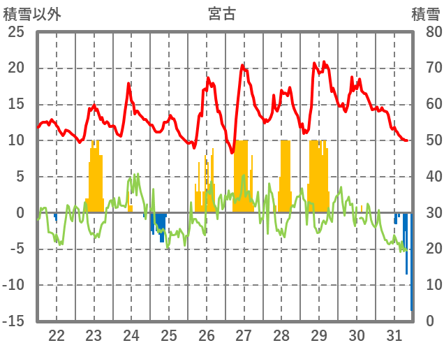 | 日 | 時 | 気温 | 降水 | 風向/風速 | 日照 | 積雪 | 降雪 |