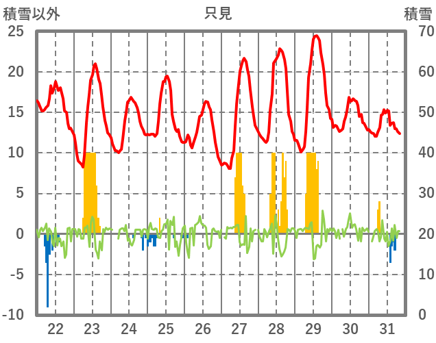| 日 | 時 | 気温 | 降水 | 風向/風速 | 日照 | 積雪 | 降雪 |